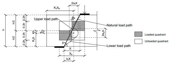 According to Kong and Sharp [47], the shear strength of a deep beam is significantly affected only when the opening interrupts the natural load path, which is considered in this study as the line joining edges of the load and support plates. The load transmission path is then divided, the primary path being the one traversing below the opening. In this model, the applied load is assumed to be transmitted to the support mainly by a lower path and partly by an upper path (Figure 8). Based on this structural idealization, the researchers proposed Equation (2) to estimate the shear capacity of RC deep beams with an opening that interrupts the natural load path. In this equation, K1 and K2 = coefficients defining the position of opening, a1 and a2 = coefficients defining the opening size, X = clear shear span, fsp = cylinder-splitting tensile strength of concrete, λ = empirical coefficient, equal to 1.5 for web bars and 1 for main bars, A = area of an individual web as well as main bar, y1 = depth at which a typical bar intersects a potential critical diagonal crack (upper and lower load path in Figure 8), α1 = angle of inclination between a typical bar and a potential diagonal crack depending on the failure mode (upper and lower load path in Figure 8), C1 = 1.4 for normal weight concrete, C2 = 130 N/mm2 for plain round bars and 300 N/mm2 for deformed bars, h = total depth of the beam, and b = width of the beam.