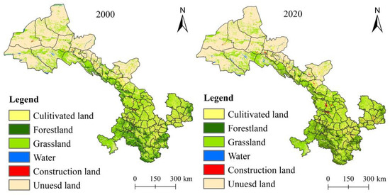 The spatial distribution of land use in Gansu Province in 2000 and 2020. Note: Cultivated land includes Paddy field, Arid land; Forest land includes Closed forest land, Shrub forest, Sparse forest, Other forest lands; Grassland includes High coverage grassland, Medium coverage grassland, Low coverage grassland; Water includes River channel, Lakes, Reservoir pit, Permanent glacier snow, Beach; Construction land includes Other construction land, Urban land, Rural settlement; Unused land includes Sandy land, Gobi, Saline-alkali land, Wetlands, Bare land, Bare rock gravel and Others.