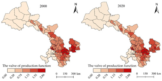 Spatial-temporal pattern of production functions in 2000 and 2020.