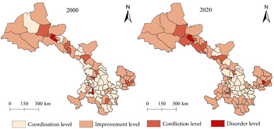 The distribution pattern of PLEF coordination in Gansu Province is relatively stable (Figure 8), and the number of coordination areas (highly coordinated type and approximately coordinated type) is obviously redundant. In 2000, the number of synergies and tradeoffs was 71 and 12, and by 2020 the number of synergies and tradeoffs was 69 and 14, indicating that the coordinated degree of PLEF in Gansu Province was high. However, from 2000 to 2020, some counties in Gannan and Longnan changed from a high degree of coordination to a basic type of coordination, and the degree of coordination decreased, mainly because with the social and economic development of the above two regions, the construction space and production space occupied part of the ecological space, resulting in the decline of the degree of coordination. The balance areas are mainly municipal government stations, such as Suzhou District of Jiuquan City, Chengguan District of Lanzhou City, Linxia city and Liangzhou District of Wuwei city. These areas are economic development centers with a large population density and a large demand for construction land. The living and production functions exceed the ecological functions, showing a strong balance state. In the past 20 years, most counties and districts in Jiuquan City have changed from synergy type to trade-off type. Therefore, on the whole, the coordinated degree of Sansheng function in Gansu Province has decreased.