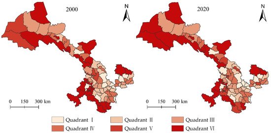 Quadrants I and VI are the leading areas of ecological functions. The regional socio-economic development lags behind, and the ecological functions are relatively prominent. From 2000 to 2020, the overall ecological functions of Gansu Province were higher than the production and living functions. Most counties are the leading areas of ecological functions, which is related to the regional geography and natural environment of Gansu Province. However, from 2000 to 2020, the number of public areas of the leading areas of ecological functions decreased by 2. In 2000, nine counties in Gansu Province were in quadrant I. these counties had a high ecological function value and low living function value. By 2020, the number of counties and cities in quadrant I increased to 11. The number of counties and cities in quadrant VI decreased from 27 to 23, and the life function was improved due to the process of urbanization, making some counties turn from quadrant VI to quadrant V and become the leading areas of life function.