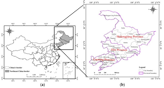 Location of study areas. (a) study area in northeast China; (b) three provinces comprising study area (Heilongjiang, Jilin, and Liaoning) ranging in latitude from 37° N to 53° N and in longitude from 115° E to 135° E.