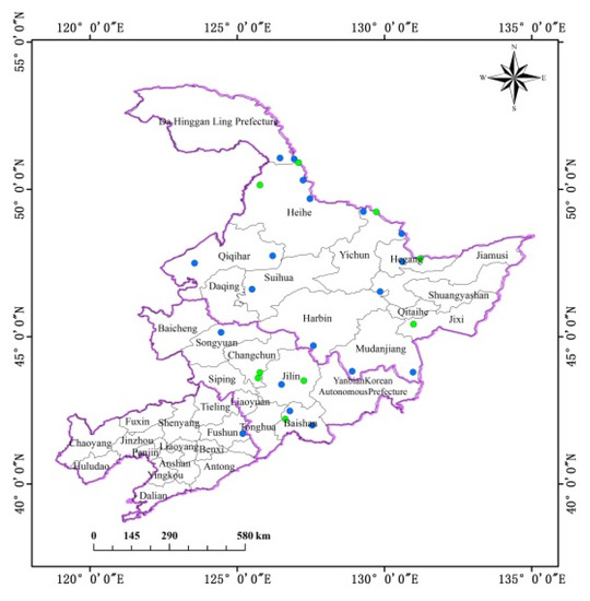 Locations of the 28 sampling sites (blue is the sampling point in 2010 and green is the sampling point in 2014), ranging in latitude from 42° to 51° N and in longitude from 120° to 131° E.