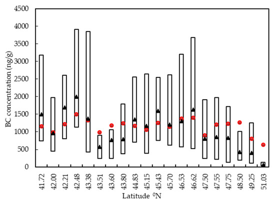 We verified the accuracy of the simulated values by comparing the simulated snow BC concentration with the measured values. Since the measured value was an uncertain range, as long as the simulated value was distributed within the range of the measured value we could consider the simulation result credible. We also used the literature comparison method to verify the simulated value. The field sampling measured datum were used to verify the simulation values of the same period (Figure 4). There are significant disagreements in the measured and modeled snow BC concentrations at individual sites, but over the region as a whole there is no apparent systematic bias in the modeled vs. measured concentrations. Zhao et al. [58] simulated the BC concentration of snow cover in northeast China in 2010, and the simulated value was above 1000 ng/g, similar to the results of this study (1197.468 ng/g). For areas north of 48° N, the simulated value was higher than the measured value. However, Flanner et al. [36] simulated the snow BC content in the high latitudes of northeast China, and the simulation result was above 1000 ng/g, which is similar to the simulation result of this study. Based on the above comparison, the ART model has a high ability to simulate the BC concentration of snow cover in northeast China, and the simulation results are credible.