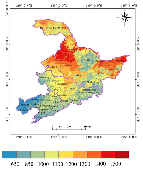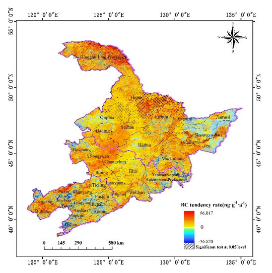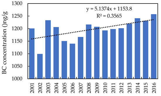 Figure 6 shows the spatial distribution of the average BC concentration over northeastern China during 2001 to 2016. There was generally a strong spatial difference in BC concentration that varied considerably over the 310–1561 ng/g range in the study area. Generally, there were two high-value (>1200 ng/g) regions of BC concentration in northeast China, both of which were located in Heilongjiang province. One is an industrial corridor composing Harbin, Daqing, Qiqihar, Suihua, and Heihe; and the other is a coal-forest industrial area composing Hegang, Jiamusi, and Shuangyashan. Conversely, the average BC concentration values were largely <850 ng/g in the mountainous areas of the study area, where human activity is minimal.
