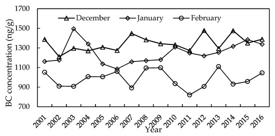 The average BC concentration was the highest in December (1344.588 ng/g), and it was gradually decreased in January (1248.619 ng) and February (983.635 ng/g), which was related to the cleaning effect of snowfall on the air. The BC concentration in December and January showed an increasing trend from 2001 to 2016, with annual increases of 7.087 ng/g and 6.556 ng/g, respectively (Figure 8); while in February, it showed a decreasing trend, with an annual reduction of 0.079 ng/g. The coefficients of variation of BC concentration from December to February were 5.601, 8.392, and 8.594, respectively, indicating that the inter-annual distribution of BC concentration in each month was relatively stable.