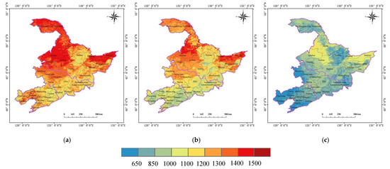 Figure 9 shows the spatial distribution of the average BC concentration in December, January, and February over northeastern China during 2001 to 2016. There was generally a strong spatial difference in BC concentration monthly that showed higher values in the north than in the south. In December, the BC content was greater than 850 ng/g, and there were three high-value centers (>1400 ng/g) in the spatial distribution, located in the Daxinganling region, northern Qiqihar and southern Heihe, and Hegang and Jiamusi regions. In January, the high-value center range shrank sharply, especially in northern Qiqihar and southern Heihe. By February, the BC content in the study area was drastically reduced, falling below 1200 ng/g. Areas with low BC concentration (<900 ng/g) were located in Yichun City, Huludao City, Chaoyang City, Fuxin City, and Dalian City.