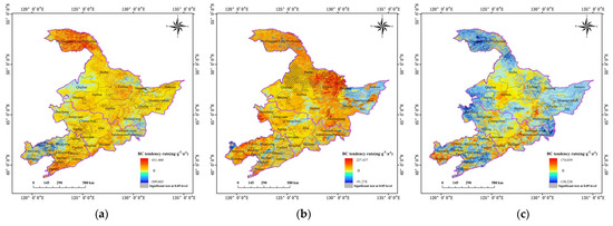 From 2001 to 2016, the increasing trend of BC content in December and January accounted for 82.519% and 82.789% of the total area, respectively (Figure 10). Among them, the BC concentration in central Heilongjiang Province and southern Liaoning increased significantly (p < 0.05), accounting for 9.922% and 10.603% of the total area, respectively, indicating that BC concentration in central Heilongjiang Province increased significantly in December and January. On the contrary, the area with a decreasing trend of BC content in February accounted for 60.110% of study area, and BC concentration decreased significantly (p < 0.05) in the southern Greater Xing’an Mountains and northern Heihe, accounting for 2.015% of the entire northeast area.