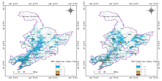 Spatial distributions of Nighttime Lights Time in northeastern China in 2001 and 2013.