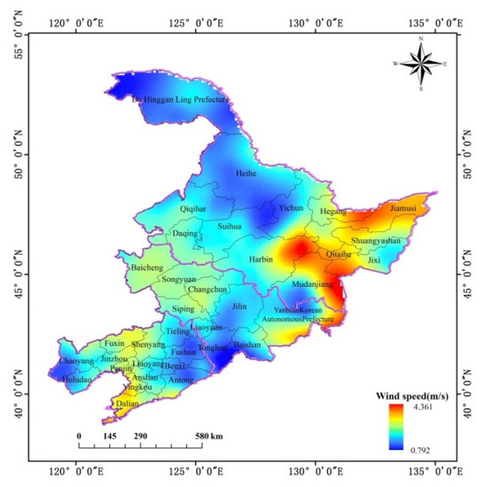 The spatial distribution characteristics of BC concentration on snow cover in northeast China are not only affected by terrain and energy consumption, but also related to winter atmospheric stability. When the atmosphere stratification is in a stable state, the poor diffusion ability of the atmosphere makes it difficult for the pollutants to diffuse; otherwise, the pollutants are easy to diffuse [62]. In this study, the average wind speed was used to characterize the stratification stability of the near-surface atmosphere. The lower the wind speed, the more stable the atmospheric layer structure, and the more likely it is to form high-concentration pollution in local areas. Figure 13 shows the average winter wind speed from 2001 to 2016 (December, January, and February the following year). It can be seen from Figure 12 that the winter wind speed was generally low and the atmospheric stratification was relatively stable. The wind speed in the eastern region was relatively high, mainly due to the formation of canyon winds between the Xiaoxing’anling Mountains and Changbai Mountains. In particular, in the central and northern regions of Heilongjiang Province, the wind speed was the lowest, therefore the atmosphere stratification in this area was stable. In addition, the winter temperature was low and the mixed layer was not high, resulting in frequent occurrence of temperature inversions. These climatic conditions hinder the diffusion of BC aerosols. Moreover, these areas were surrounded by mountains on three sides, and the BC aerosols were more difficult to transport outwards and accumulate near the ground. They enter the snow surface through dry deposition, resulting in northern Qiqihar, southern Heihe, and northern Suihua being the high centers of BC in the northeast.