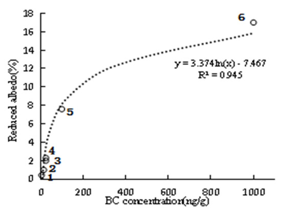 Logarithmic scatter plot for BC concentrations and reduced albedos (hollow circles) in snow and ice based on previous studies, and the simple linear relationship possibly existing between them. The data of the 6 points in the figure are from the literature: 1-Jacobson [8]; 2-Warren [3]; 3-Jacobson [8]; 4-Clarke and Noone [24]; 5-Jacobson [8]; 6-Flanner [7].
