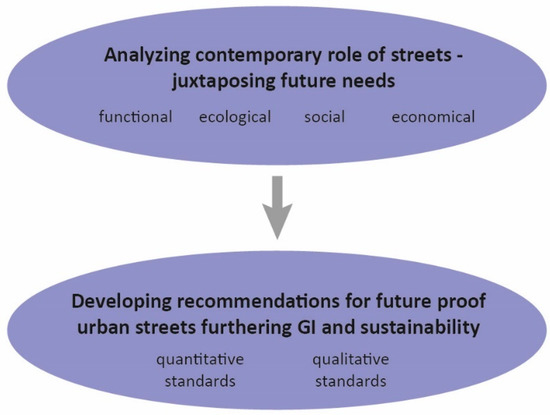 Streets can be seen as linear urban open spaces which require a set of properties to achieve the goal of sustainable development, namely meeting today’s needs without limiting future ones [35]. The review focuses on functional, ecological, social and economic aspects which determine the streets’ role as a sustainable public open space. Their limited surface from façade to façade has to accommodate all these qualities in a good balance which allows for flexible use. Recommendations are defined based on these findings (Section 3.4).