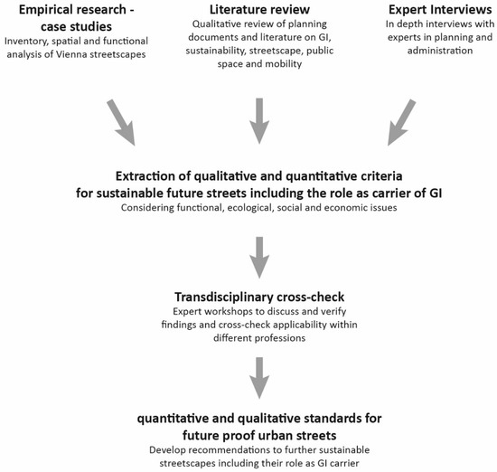 The study is based on a mixed-method approach (Figure 2). The research consists of literature work, an elaboration of empirical data and expert interviews, which together allow us to derive qualitative and quantitative aspects which need to be realised in order to create sustainable streets that serve as carriers of green infrastructure. The study examines public space in Vienna, particularly urban streets of all types. Highways and roads with heavy traffic that are not in the legal responsibility of Vienna City Administration were excluded.