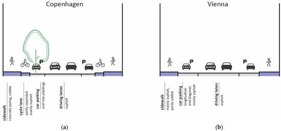 Structural differences between cities are shown by average layouts, calculated from 10 streets in each city. (a) While Copenhagen provides continuous bicycle infrastructure as well as trees in more than half of the streets investigated, (b) Vienna is dominated by cars.