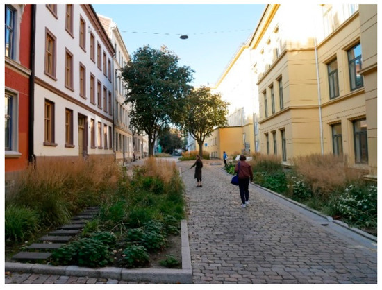 Stockholm, Rotterdam, Oslo and Copenhagen, among other cities, explicitly demand a progressive reinterpretation of a street’s role against climate change in their planning documents [48,49,50,51,52,53]. Pilot sites such as Oslos Deichmans gate (Figure 6) or the Østerbro Quarter in Copenhagen are evolving; the latter is even called Copenhagen’s first climate-resilient neighbourhood [43,49], where green streets, green urban squares, and cloudburst streets that divert rainwater away from the neighbourhood have been realised. The ambitious goal is to use green and blue solutions to disconnect 30% of the rainwater from the sewers in the Climate Resilient Neighbourhood. These solutions are promoted as cheaper, easier, and more flexible than conventional solutions of rainwater runoff into sewers and bring benefit as more inviting public space with greener streets and improved urban space [49,53].