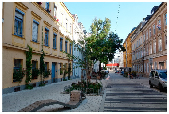 Design aspects and provision of sufficient space are, however, only one step on the transition from the street as a traffic space to a green living space; further significant steps become relevant. One is the change in people’s association and perception of streets as a result of established car-dependent habits and lifestyles. Another step is the legal frameworks and regulations which influence the behaviour and the future use of streets [37,83]. A transformational process of streets cannot be seen isolated. It has to be further supported by inviting alternatives to car dependency such as a well-functioning, city-wide public transport system, sharing opportunities, an inviting bicycle infrastructure and not least a comfortable and functional walking atmosphere. The benefits of greenery need to be transported and planning strategies such as “Stadt der kurzen Wege” or “15-minute city” which strive for a mixed urban fabric can be seen as the structural backbone.