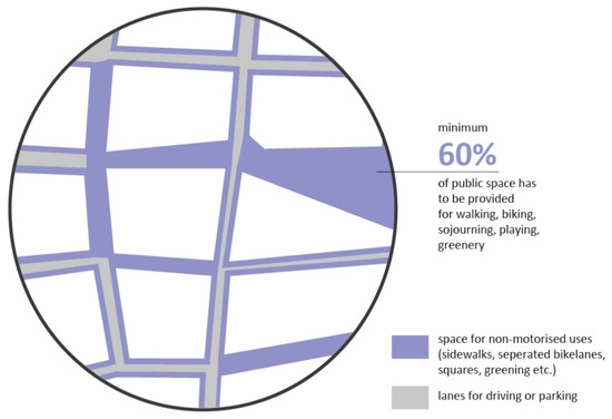 Schematic illustration, minimum 60% of all hard-surface public space in new development areas has to be dedicated for non-motorised uses and greening, consisting of sidewalks, pedestrian streets, bicycle lanes, squares or the like.