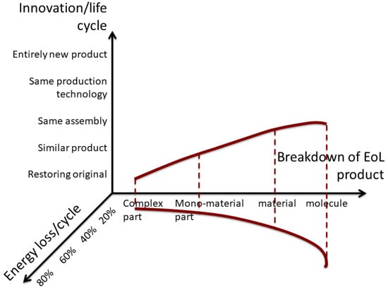 Figure 1 illustrates the relationship between circularity (inversely proportional to the degree of innovation for each life cycle), breakdown level (from entire objects to molecular level reduction), and energetic costs. It can be said that on the “Breakdown of End-of-Life product” axis, recycling of complex parts or mono-material parts can be considered as a product-based approach, as they only involve extraction and maintenance of such parts. Re-use of bottles, for instance, is also a form of mono- or bi-material “parts”.