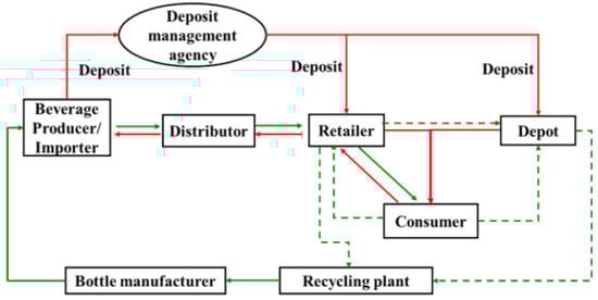 General diagram of the operation mechanism of the container-deposit logistics of beverage glass bottles by Zhou et al. [41]. The red arrows correspond to the deposit flow (product recycling), while the green arrows represent the alternative material recycling flow, in the case the bottles are discarded.