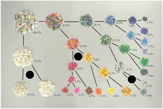Illustration of successive steps of logarithmic sorting, considering only the color of plastic flakes [49].