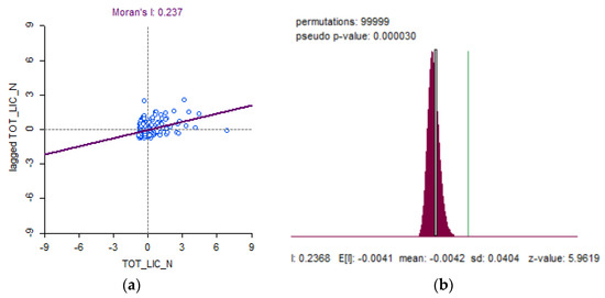 Moran’s I Test Statistics for the number of radioactive materials licenses. (a) Moran’s I scatter plot for the number of radioactive materials (Moran’s I = 0.237); (b) Reference distribution for Moran’s I (pseudo p-value = 0.000030). (Note: TOT_LIC_N = number of radioactive material licenses in a region; lagged TOT_LIC_N = the average number of radioactive material licenses in the neighboring regions of a region.).