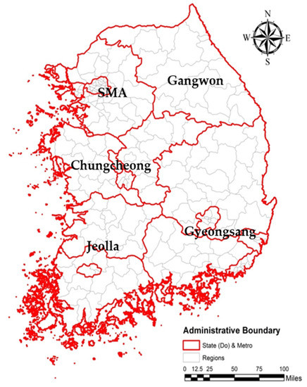 South Korea is composed of nine administrative provinces (‘do’ in Korea, equivalent to a state in the US) and eight metropolitan areas, including Seoul. The SMA (Seoul Metropolitan Area) is composed of two metropolitan areas (Seoul and Incheon) and one province (Gyeonggi-do). In total, there are 17 administrative regions, which are further decomposed into 250 smaller administrative regions. In this study, Korea is subdivided into five broader geographic divisions for policy development: the SMA, Chungcheong, Gyeongsang, Jeolla, and Gangwon, as shown in Figure 3.