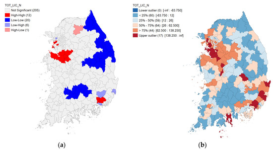 LISA and Box Plot maps for the permitted amount of the license for use.: (a) LISA maps for the permitted amount of the license for use; (b) Box Plot maps for the permitted amount of the license for use. (Note: RI_C_RIU_A = permitted use amount of RI use report and permit combined in a region).