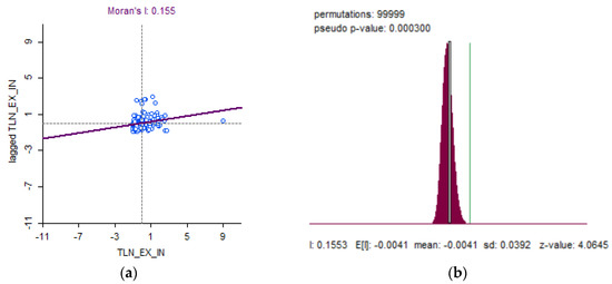 Moran’s I Test statistics for the number of radioactive material licenses excluding industrial use. (a) Moran’s I scatter plot for the number of radioactive material licenses excluding industrial use (Moran’s I = 0.155); (b) Reference distribution for Moran’s I (pseudo p-value = 0.000300). (Note: TLN_EX_IN = number of radioactive material licenses excluding industrial use in a region; lagged TLN_EX_IN = the average number of radioactive material licenses excluding industrial use in the neighboring regions of a region.).