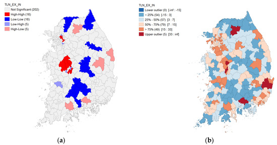 LISA and box plot map for the number of radioactive material licenses excluding industrial use. (a) LISA map for the number of radioactive material licenses excluding industrial use; (b) Box plot map for the number of licenses excluding industries. (Note: TLN_EX_IN = number of radioactive material licenses excluding industries in a region.).