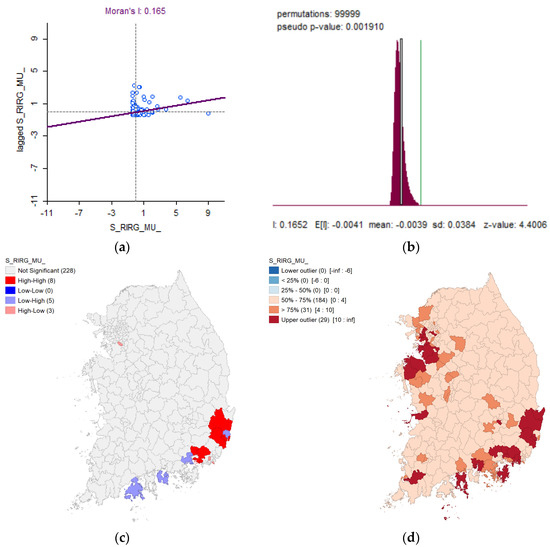 Moran’s I Test Statistics, LISA, and box plot maps for the number of RI mobile-use sites. (a) Moran’s I scatter plot for the number of RI mobile-use sites (Moran’s I = 0.165); (b) Reference distribution for Moran’s I (pseudo p-value = 0.001910); (c) LISA map for the number of RI mobile-use sites; (d) Box plot map for the number of RI mobile-use sites. (Note: S_RIRG_MU_ = number of RI mobile-use sites in a region; lagged S_RIRG_MU_ = the average number of RI mobile-use sites in the neighboring regions of a region.).