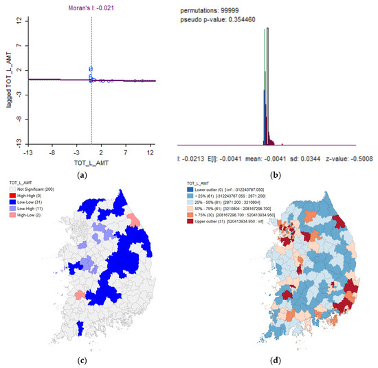 Moran’s I Test Statistics, LISA and Box Plot maps for the permitted use amount of radioactive materials.: (a) Moran’s I Scatter Plot for the permitted use amount of radioactive materials (Moran’s I = −0.021); (b) Reference distribution for Moran’s I (pseudo p-value = 0.354460); (c) LISA map for the permitted use amount of radioactive materials; (d) Box Plot map for the for the permitted use amount of radioactive materials. (Note: TOT_L_AMT = permitted use amount of radioactive material licenses in a region; lagged TOT_L_AMT = the average permitted use amount of radioactive material licenses in the neighboring regions of a region).