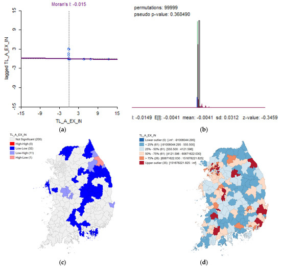 Moran’s I Test Statistics, LISA and Box Plot maps for the permitted use amount of radioactive materials excluding industrial use.: (a) Moran’s I Scatter Plot for the permitted use amount of radioactive materials excluding industrial use (Moran’s I = −0.015); (b) Reference distribution for Moran’s I (pseudo p-value = 0.368490); (c) LISA map for the permitted use amount of radioactive materials excluding industrial use; (d) Box Plot map for the permitted use amount of radioactive materials excluding industrial use. (Note: TL_A_EX_IN = permitted use amount of radioactive materials excluding industrial use in a region; lagged TL_A_EX_IN = the average permitted use amount of radioactive materials excluding industrial use in the neighboring regions of a region).