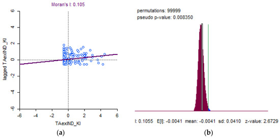 Moran’s I test statistics for the permitted use amount of radioactive materials excluding both industrial use and high-risk facilities. (a) Moran’s I scatter plot for the permitted use amount of radioactive materials excluding both industrial use and high-risk facilities (Moran’s I = 0.105); (b) Reference distribution for Moran’s I (pseudo p-value = 0.008350). (Note: TAexIND_KI = permitted use amount of radioactive materials excluding both industrial use and high-risk facilities in a region; lagged TAexIND_KI = the average permitted use amount of radioactive materials excluding both industrial use and high-risk facilities in the neighboring regions of a region.).