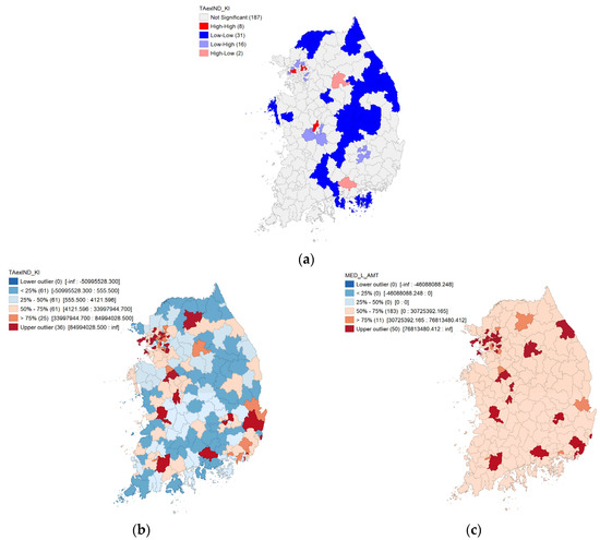 LISA and Box Plot maps for the permitted use amount excluding both industrial use and high-risk facilities.: (a) LISA maps for the permitted use amount excluding both industrial use and high-risk facilities; (b) Box Plot maps for the permitted use amount excluding both industrial use and high-risk facilities; (c) Box Plot maps for the permitted use amount medical use. (Note: TAexIND_KI = permitted use amount of radioactive materials excluding both industrial use and high-risk facilities in a region; MED_L_AMT = permitted use amount of radioactive material for medical use in a region).