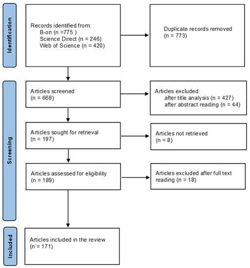 The PRISMA flow diagram [] for the present SLR is presented in Figure 1. The search was performed in January 2021, and a total of 1441 records was found, reduced to 668 articles after duplicates were removed. The first screening of the articles derived from a title analysis, excluding those that did not focus specifically on indoor air quality in healthcare facilities. This step reduced the sample to 241 articles, which were further analyzed through abstract reading. At this stage, 44 articles were excluded because they focused exclusively on lab-scale research or simulation studies. The full-text reading of the remaining 197 articles resulted in 26 of those being excluded from the sample, either because they were not accessible (eight articles), or because they were outside the inclusion criteria described above. Thus, the final sample comprised 171 articles (the complete list of references is available in Supplementary Materials.