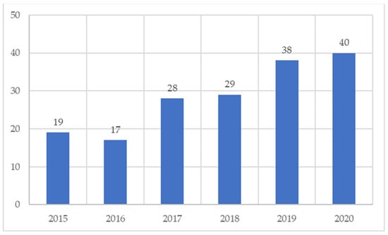 The trend on the number of publications on IAQ in healthcare facilities over time, for the period 2015–2020, clearly shows that there has been an increasing interest in the subject (Figure 2). Published articles more than doubled in number from 2015 (19 papers) to 2020 (40 papers).