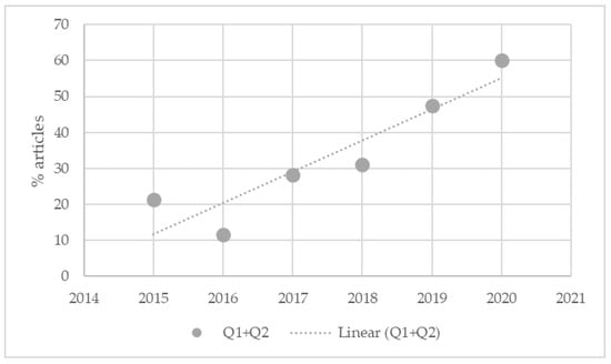 Trend of percentage distribution of articles in journals within the Q1 and Q2 quartiles.