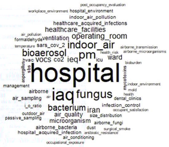 - Cluster 3 is related to the environmental control of healthcare facilities. The most impacted words (higher Chi-squared values) are: infection (130.6), control (73.7), patient (53.2), ventilation (51.5), system (42.3) and hospital (42.2). These studies reveal great concern regarding air quality in operating rooms’ air flow environment [,,]. The importance of adequate particle filtration systems is also highlighted in several studies [,,,,]. The influence of ventilation on the prevalence of hospital infections has also been studied [,,], including studies on SARS-CoV-2 infection [,,,,]. Cleaning procedures also have an important role in the control of microbiological loads [,,,]. Regular monitoring of indoor environmental conditions is essential to assess the efficiency of environmental control practices [,,,].