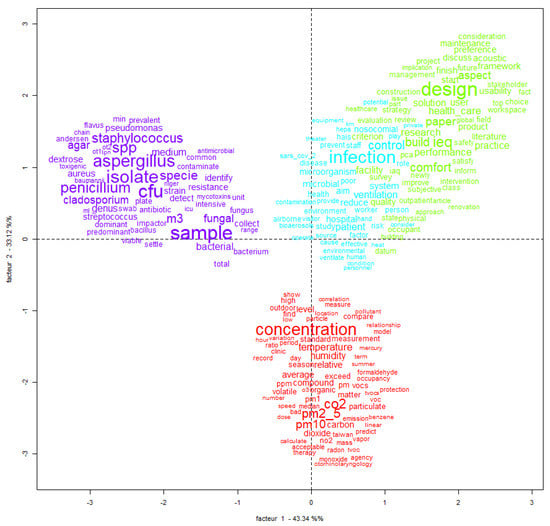 The lexicographic analysis of the textual corpus for the abstracts produced 40,381 occurrences, with 4075 active forms in a total of 4822 lexical forms (words). The most frequent active forms were air (547), hospital (465), indoor (437), concentration (302), and study (274), and 3438 of the active forms had a frequency higher than or equal to 3.