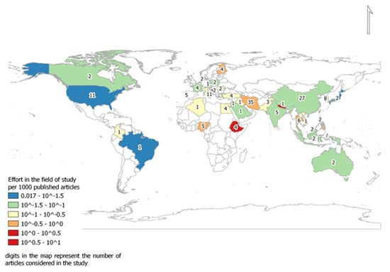 Surprisingly, a higher GDP does not mean research interest in the subject—the countries with higher GDP showed little publication effort in this field during the period of study (Figure 8). On the other hand, countries like Bosnia and Herzegovina, Ethiopia, and Nepal show the highest publication effort in the topic (number of published articles per 1000 publications).