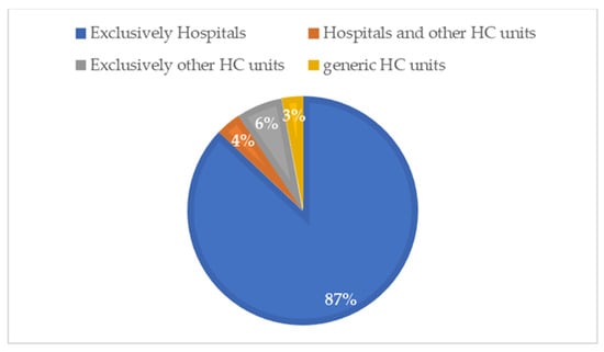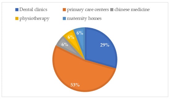 Hospitals were the healthcare unit of major interest for the IAQ studies, being studied in 91% of the sampled papers (Figure 9). Other healthcare units, specifically focused in 17 papers, highlight the IAQ concern in primary care centers (53%) and dental clinics (29%) (Figure 10). The most frequently analyzed locations are operating rooms, wards and intensive care units.