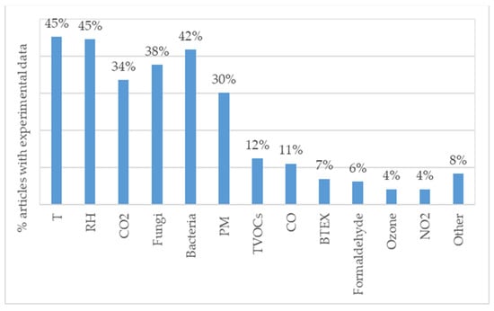 The parameters that were measured in the papers with experimental data are shown in Figure 12. The most frequently reported parameters are related to environmental quality—temperature (T) and relative humidity (RH)—and with microbiologic contamination—bacteria and fungi load. Measurements of the concentration of carbon dioxide (CO2) and particulate matter (PM) were also frequently reported. In what concerns chemical contaminations, the most frequently monitored compounds were total volatile organic compounds (TVOCs), carbon monoxide (CO), benzene, toluene, ethylbenzene and xylene (BTEX), and formaldehyde. Other parameters that were measured in at least one of the sampled papers were ammonia and nitrogen oxide [], anesthetic gases [,], limonene [], mercury vapor [], n-hexane and styrene [], polycyclic aromatic compounds (PAH) [], trichloroethylene and tetrachloroethylene [], and phthalates []. Ultra-fine particles and black carbon, which have recently been considered a priority research target by the World Health Organization (WHO) [], were focused on in only three of the sampled articles [,,].