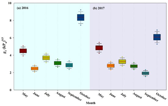 Stomatal conductance slope (g1) varies in different growing seasons (from May to October) in 2016 (a) and 2017 (b), respectively. Boxes mark the 75th and 25th percentiles, and the dashed and solid lines in the boxes refer to the average and median values, respectively.