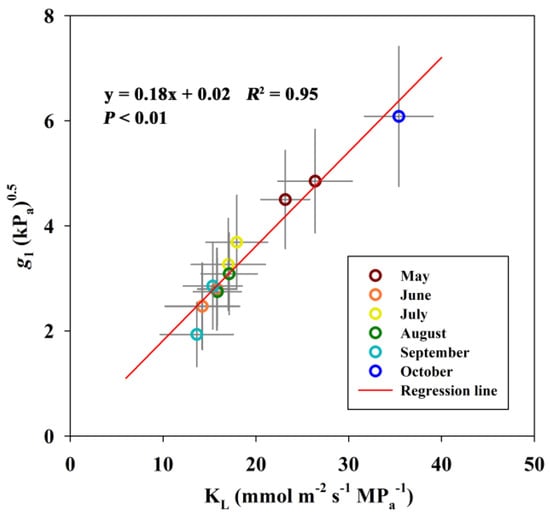 To evaluate the relationships between g1 and plant hydraulic conductance. Regression analysis between g1 and KL in different months was conducted (Table 1). g1 showed a significant linear positive correlation with KL across the entire growing seasons, with a slope and R2 of 0.18 and 0.95, respectively (Figure 7; p < 0.01).
