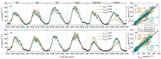 Diurnal courses of the observed gs over three consecutive sunny days each month during growing seasons are shown in Figure 3. Diurnal courses of gs demonstrated unimodal curves throughout the day, although slight fluctuations existed in some moments. This type of unimodal curve was observed throughout growing seasons and showed no significant inter-annual variations. Before sunrise, gs kept a relatively stable level, with mean values of 17.12 and 18.99 mmol m−2 s−1 in 2016 and 2017, respectively. After sunrise, with the increase in temperature and radiation, gs had a rapid increase between 8:00 and 11:00 local time. Peak values of gs mainly occurred mid-day (from about 12:00 to 14:00 in local time), with average values of 138.47, 140.51, 172.39, 168.45, 111.36, and 131.50 mmol m−2 s−1 in different months (from May to October, respectively). Then, gs declined gradually from 14:00 to 20:00. After sunset, gs dropped to a low value and remained stable.