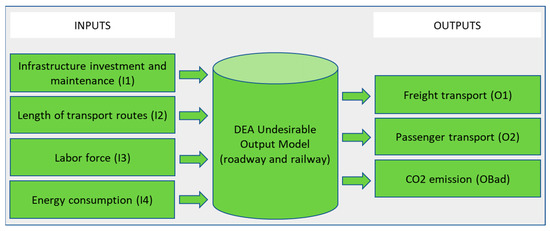Based on the previous discussion, the hypothesis was formulated, evaluating the efficiency of land transportation is a vital process to improve operation efficiency, decrease investment costs, save energy, reduce greenhouse gas emissions, and enhance environmental protection. This research focuses on estimating the environmental efficiency for land transportation by using a DEA undesirable output model that overcomes previous models to handle unwanted data. The purpose of the present study is to propose the DEA undesirable output model for measuring the performance of land transportation of 25 OECD countries as 25 decision-making units (DMUs). Differences in infrastructure investment, the demand for transport, and the length of routes are the factors that identify the ranking of DMUs. The research process is visualized in Figure 1. The model is used as an explicit function of four inputs (infrastructure investment and maintenance, length of transport routes, labor force, and energy consumption). The outputs consist of freight transport and passenger transport as desirable outputs, while carbon dioxide emission (CO2) is considered as an undesirable output. The outcome of this study can support the government or policymakers in evaluating and improving the environmental efficiency of land transportation or many more related industries.