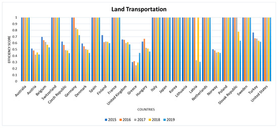 The DEA method is thought to be an excellent approach to evaluate the relative efficiency of DMUs with many inputs and outputs, and it does not require determining the relationships between inputs and outputs through subjective assumptions. In this research, we used DEA with an undesirable output model to measure the environmental efficiency of land transportation in 25 OECD countries for the period 2015–2019. It uses infrastructure investment and maintenance, the length of transport routes, labor, and energy consumption as inputs. The model’s outputs are total passenger and freight transport and CO2 emission. As a result, the list of countries with the best efficiency score for land transportation includes Australia, Switzerland, Spain, France, Italy, Japan, Korea, Lithuania, The Netherlands, Poland, Sweden, and the USA. The average overall efficiency of land transportation systems in 25 OECD countries expresses decreasing trend. For managerial implications, this study could be a significant material for stakeholders, i.e., governments, and authorities in evaluating and improving the environmental efficiency of land transportation or many more related industries. The DEA-based approach assists in implying those countries who have not been utilizing their resources to generate the best possible outcomes in land transportation (those with low efficiency). Therefore, there is huge space for them to improve their efficiency performance, in which the improvement can be achieved by more efficient use of their current resources, rather than increasing the resources. The reason behind the change can be traced to political and/or economic situations.