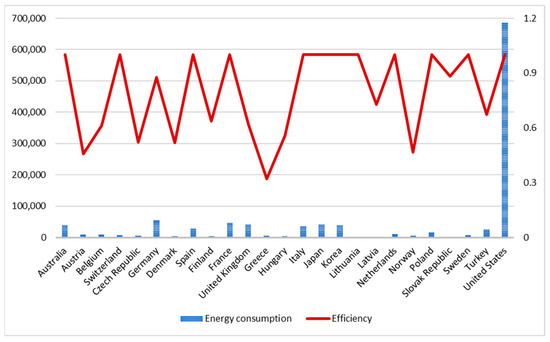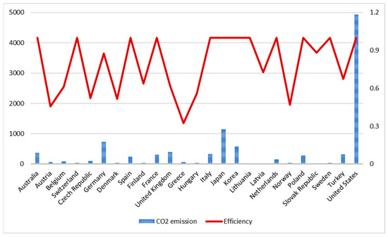 Figure 5 and Figure 6 show the relationship between the average efficiency and environmental variables including energy consumption and CO2 emissions. We can observe that most countries such as Australia, Japan, Korea, and the USA consume a large amount of energy, but the efficiency is also higher than other countries. On the other hand, Greece, Austria, and Norway are three countries that accounted for the lowest efficiency score despite their consumption of a small amount of energy. The nations that have high CO2 emissions are high operation efficiency.
