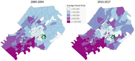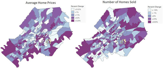 The percent change in average home prices and the number of homes sold between 2000–2004 and 2013–2017 is shown in Figure 4. Across all CBGs in Knox County, the percent change in average home prices ranges from −21% to 528%, with a mean of 30%. The percent change exceeds 42% for several CBGs in west and south Knoxville. Focusing on CBGs that contain Urban Wilderness parks or are adjacent to an Urban Wilderness park, the growth in average home prices varies by CBG. Some CBGs near the Urban Wilderness experienced a decline in average home prices or modest growth while other CBGs experienced significant growth.