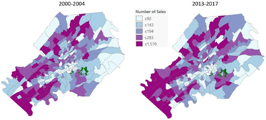 Number of homes sold by census block group between 2000–2004 and 2013–2017. Notes: Category values represent the 20th, 40th, 60th, and 80th percentile and the maximum value. The Urban Wilderness parks are shown in the color green. Source: Knox County Property Assessor data obtained from KGIS.